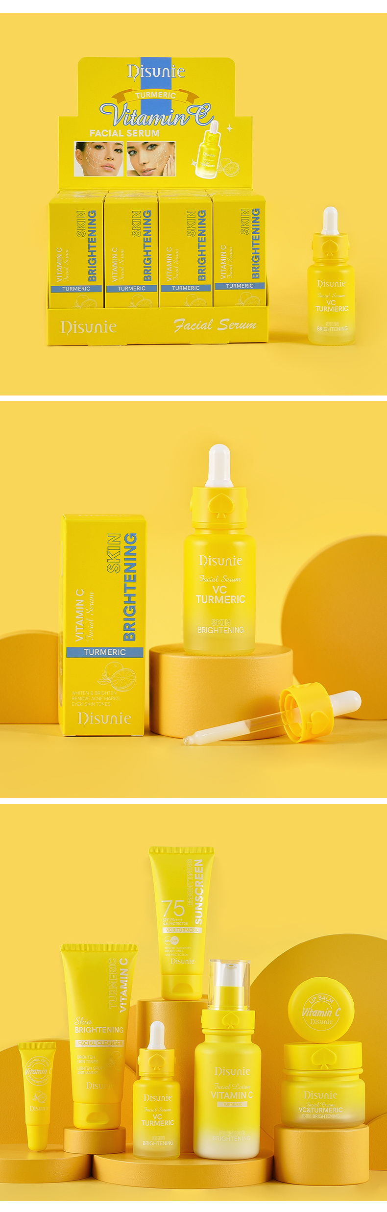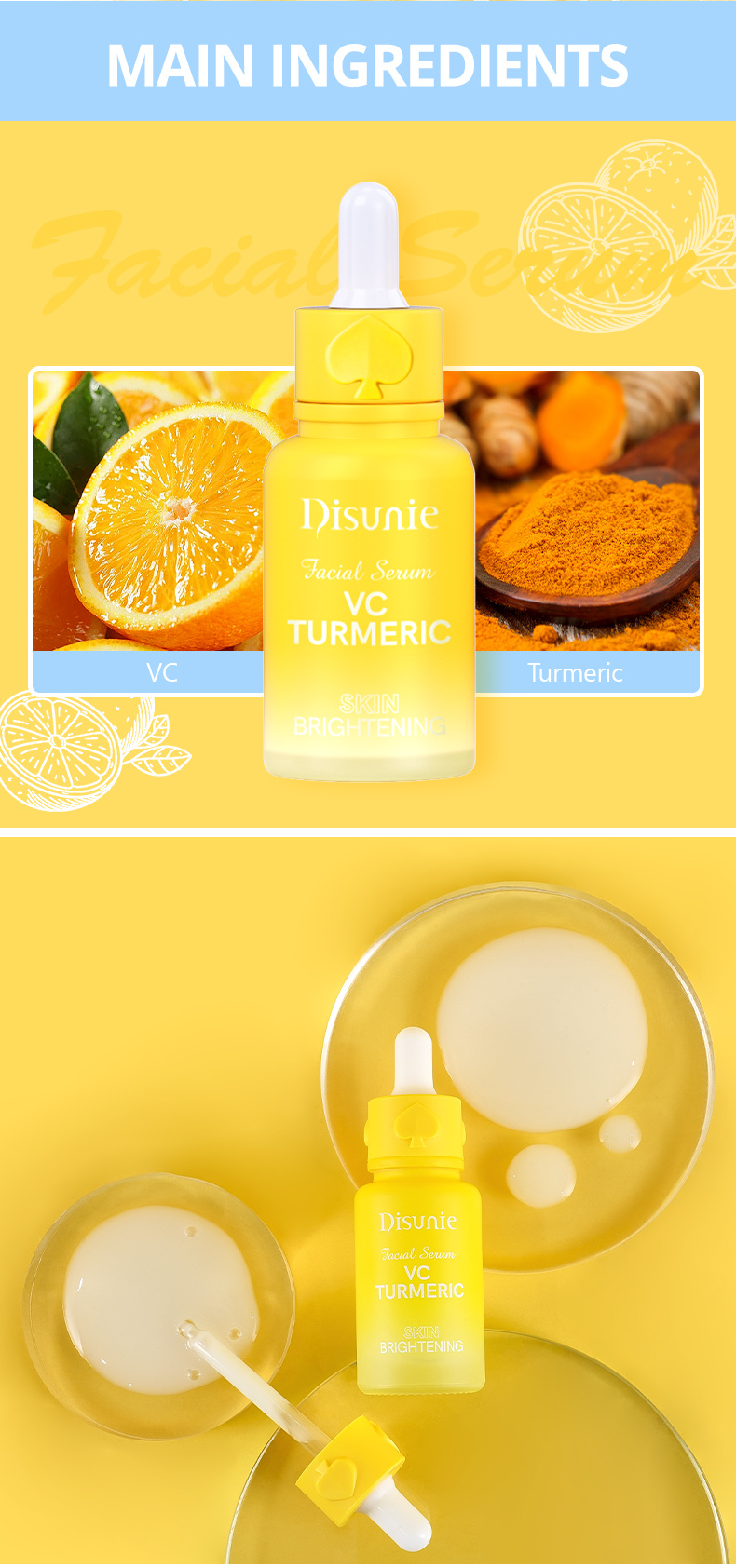 Disunie's Vitamin C & Turmeric Facial Serum is a concentrated formula designed to boost radiance, fade dark spots, and promote a more even complexion. Vitamin C, a powerful antioxidant, helps protect against free radicals while enhancing skin brightness and clarity. Turmeric Extract, known for its anti-inflammatory and skin-balancing properties, works to reduce redness, calm blemishes, and support an even skin tone.